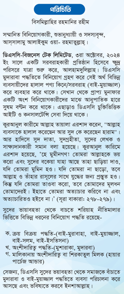 ডিএসসি-বিজনেস টেক লিমিটেড, ৩রা অক্টোবর, ২০২৪ ইং সালে একটি সরবরাহকারী প্রতিষ্ঠান হিসেবে ক্ষুদ্র পরিসরে যাত্রা শুরু করে, আলহামদুলিল্লাহ। ডিএসসি মুদারাবা পদ্ধতিতে বিনিয়োগ গ্রহণ করে সেই অর্থ বিভিন্ন ব্যবসায়ীদের হালাল পণ্য কিনে/সরবরাহ (বাই-মুয়াজ্জাল) করে ব্যবহার করে থাকে। সেখান থেকে প্রাপ্য মুনাফার একটি অংশ বিনিয়োগকারীদের মাঝে আনুপাতিক হারে সুষম বণ্টন করে থাকে। এছাড়াও ডিএসসি চুক্তিভিত্তিক আইটি ও কনসালটেন্সি সেবা দিয়ে থাকে।